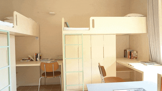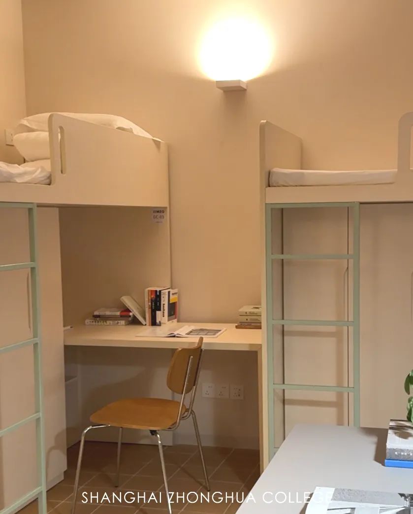 推开定制化实木门,四人间特有的宽敞感扑面而来,米白色上床下桌组合彰显着现代风格,床铺采用ENF级(无醛添加级)环保材质,198cm×90cm的尺寸早已预留了充足的舒展空间,床头折叠阅读灯与轨道窗帘构成私密的睡眠系统,智能空调以恒定温柔,将四季更迭隔绝在宿舍之外。